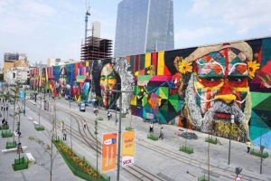 Um artista muito importante que traz vida e mais cores para o espaço urbano é o Eduardo Kobra, ele é um artista plástico brasileiro, grafiteiro e muralista, autor de diversos murais em escala monumental espalhados por vários países como: Inglaterra, França, Estados Unidos, Rússia, Grécia, Itália, Suécia e Polônia. Uma das suas maiores obras foi feita em 2016 durante os jogos olímpicos do Rio de Janeiro, chamada “Etnias”, tem mais de 3 mil metros quadrados, retrata figuras indígenas dos 5 continentes, esse mural foi parar no Guinness Book como o maior mural de grafite do mundo, mas em 2018, pintou um mural com mais de 5 mil metros quadrados, que mostra uma única cena o processo do cacau. Podemos também citar outras obras como: “Muro das memórias”, “O beijo” em Nova york, desenvolveu o projeto “Olhar pela paz” onde ele retrata figuras históricas, ícones da luta pela paz como: Albert Einstein, Anne Frank, John Lennon, e também faz crítica à violência dos animais, aquecimento global e desmatamento.