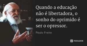 Para Paulo Freire, toda educação é política – e não existe neutralidade. Enquanto a missão da “educação bancária” é eliminar a capacidade crítica dos alunos e acomodá-los à realidade, a “educação problematizadora” quer despertar a consciência dos oprimidos, inquietá-los e levá-los à ação (libertação). Nasceu em 19 de setembro, Recife – Pernambuco e faleceu em 2 de maio de 1997 em São Paulo. Para o educador pernambucano, o estudante precisa aprender a ler o mundo para poder transformá-lo. “Não basta saber ler mecanicamente ‘Eva viu a uva’. É preciso compreender qual a posição que Eva ocupa no seu contexto social, quem trabalha para produzir uvas e quem lucra com esse trabalho”. Paulo Freire in Moacir Gadotti, Paulo Freire: Uma Biobibliográfica, 1996. Aprender é um ato revolucionário. Por meio da educação, e de maneira coletiva, o indivíduo deve tomar consciência de sua condição histórica, assumir o controle de sua trajetória e conhecer sua capacidade de transformar o mundo. Assim pode ser resumida a ideia central do pensamento do pernambucano Paulo Freire (1921-1997), o mais notável educador brasileiro, reconhecido internacionalmente por sua concepção libertária e autônoma de educação e por seu método inovador de alfabetização de adultos. “Ninguém luta contra forças que não entende; ninguém transforma o que não conhece…”. “Quando a educação não é libertadora, o sonho do oprimido é ser o opressor”.