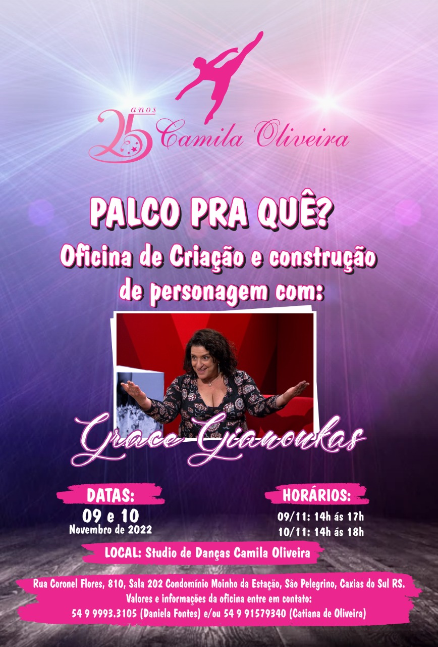 PALCO PRA QUÊ? OFICINA DE CRIAÇÃO E CONSTRUÇÃO DE PERSONAGENS COM GRACE GIANOUKAS! Partindo do pressuposto que todo discurso público … Confira…
